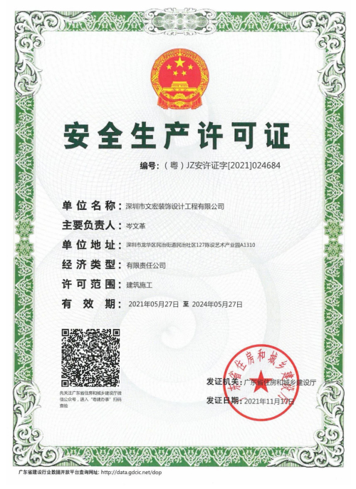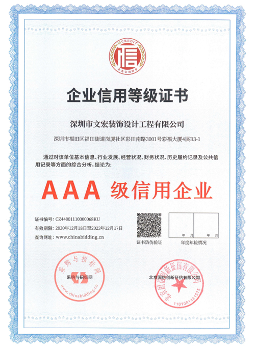 Wenhong Decoration Design Engineering Co., LTD企業通過ISO 9001質量管理體系認證證書,ISO 14001環境管理體系認證證書,OHSAS 18001職業健康安全管理體系認證證書,廣東省市場監督管理局授予“廣東省守合同重信用企業”是廣東省建筑裝飾協會會員單位,深圳市裝飾行業協會會員單位;廣東省建筑裝飾行業AAA級信用企業,中國采購與招標網AAA級信用企業。